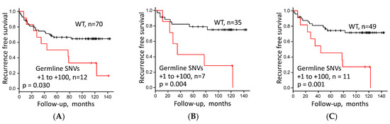 Recurrence-free survival stratified by (A) presence or absence of germline single-nucleotide variants (SNVs) at any site at positions +1 to +100 in the rDNA promoter region (presence versus wild type (WT)) in 82 lung adenocarcinoma (LUAC) patients, and (B) germline SNV at positions +1 to +100 in the rDNA promoter region (presence versus WT) in Stage I LUAC excluding MIA (n = 42), and (C) in Stage I/II LUAC excluding MIA (n = 60).