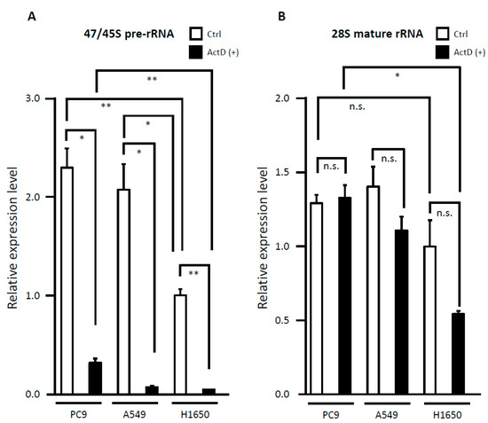 Evaluation of rRNA expression and the effect of low-dose Actinomycin D (50 ng/mL, 2 h) treatment in lung adenocarcinoma cell lines. (A) 47/45S precursor ribosomal RNA (pre-rRNA) and (B) 28S mature rRNA. Relative transcription level of untreated H1650 cells was assumed as 1. n.s., not significant; * p < 0.05; ** p < 0.01.