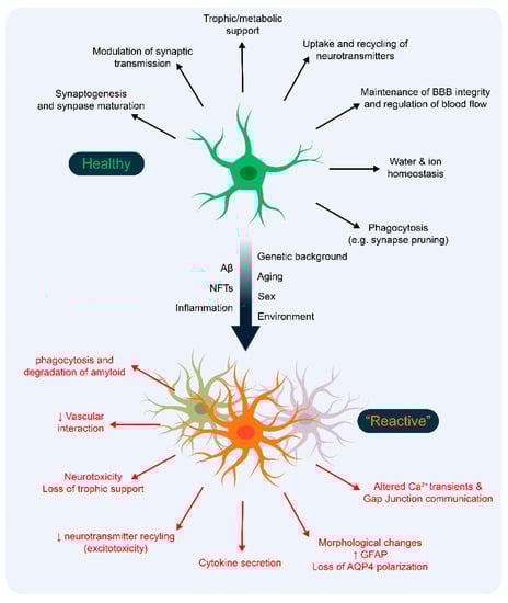 Summary of some main physiological functions of healthy astrocytes (top) and AD-induced changes in reactive astrocytes (bottom, multiple heterogeneous sub-states). Multiple AD-implicated risk factors (indicated next to the black arrow) contribute to changes in astrocyte function. The term “reactive” is representative of multiple reactive astrocyte sub-states that exist, each with differential functions, which are either beneficial or detrimental during AD pathogenesis. These sub-states may change according to disease progression, sex, aging, and underlying mutations or secondary pathology (e.g., inflammation). Abbreviations: Aβ = amyloid beta; AD = Alzheimer’s disease; AQP4 = aquaporin 4 water channel; BBB = Blood-brain barrier, GFAP = glial fibrillary acidic protein; NFT = neurofibrillary tangles (of Tau).