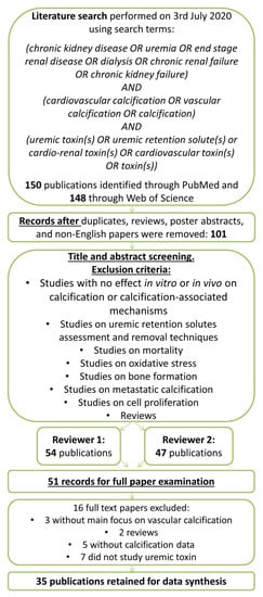The authors performed an advanced search in both PubMed and Web of Science to identify eligible studies on 3 July 2020. The search strategy is depicted in Figure 1. The following terms and conditions were used for the systematic literature search: chronic kidney disease OR uremia OR end stage renal disease OR dialysis OR chronic renal failure OR chronic kidney failure AND cardiovascular calcification OR vascular calcification OR calcification AND uremic toxin(s) OR uremic retention solute(s) OR cardio-renal toxin(s) OR cardiovascular toxin(s) OR toxin(s). Where indicated, additional literature on identified uremic toxins was added manually after checking the reference lists of the included studies or recent reviews, when required for a correct interpretation of findings. The Preferred Reporting Items for Systematic Reviews and Meta-Analyses (PRISMA) guidelines were followed while composing and writing the systematic review. The systematic review was registered in the PROSPERO database (CRD42016051604) on 16 November 2016 [28].