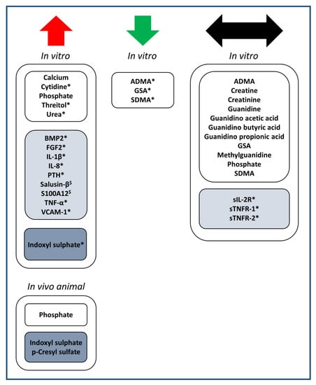 ADMA, SDMA, and GSA (Table 1): Guanidino compounds constitute a large group of low molecular weight uremic toxins that are generated as a result of protein and amino acid metabolism. They can exert pro-inflammatory as well as anti-inflammatory effects, which may modulate the prevalence of CVD in patients with CKD [67]. Among investigated guanidino compounds, ADMA, SDMA, and GSA inhibited cardiovascular calcification in human VSMC in high inorganic phosphate media [29]. The underlying mechanisms still remain to be clarified, as ADMA, SDMA, and GSA exerted mainly pro-inflammatory effects, at least on leukocytes [29].