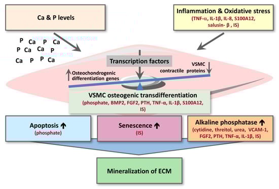 Scheme of uremic toxins affecting different regulatory steps of cardiovascular calcification. For details, we refer to the text. In red are shown the inducers of cardiovascular calcification. BMP2—bone morphogenetic protein 2; Ca—calcium; ECM—extracellular matrix; FGF2—fibroblast growth factor 2; IL-1β—interleukin-1 beta; IL-8—interleukin-8; IS—indoxyl sulphate; P—phosphate; PTH—parathyroid hormone; TNF-α—tumor necrosis factor-alpha; VCAM-1—vascular cell adhesion molecule-1; VSMC—vascular smooth muscle cell.