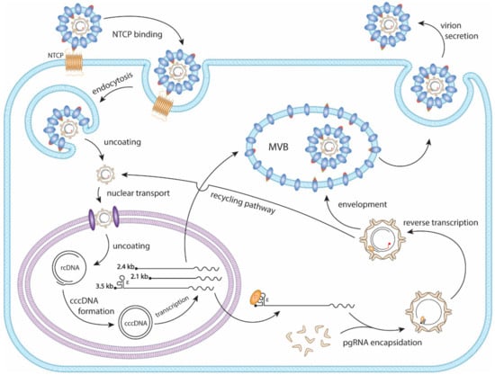 The HBV replication cycle. The HBV virion binds to the hepatic NTCP protein and is endocytosed. The viral membrane then fuses with the endosome, releasing the capsid into the cytoplasm, followed by nuclear import. The rcDNA is released into the nucleus where it uses host DNA repair mechanisms to form cccDNA. Viral mRNAs are transcribed from the cccDNA and are translated to viral proteins. In the cytoplasm, the viral polymerase binds to the epsilon (ε) structure of pgRNA and is encapsidated by core proteins. Within the nucleocapsid the pgRNA undergoes reverse transcription to form rcDNA. The mature capsid is enveloped and secreted as a virion particle through the MVB secretory pathway. The mature capsid can also be shuttled to the nucleus where it will amplify cccDNA through a process termed the rcDNA recycling pathway.