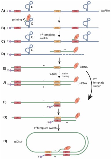 HBV rcDNA and dslDNA synthesis. (A) The encapsidated pgRNA is the template for HBV reverse transcription. (B) Inside of viral capsid, HBV polymerase binds to the ε structure of the pgRNA and begins priming with 3 nucleotides. (C) The first template switch occurs and the polymerase along with the covalently attached primed DNA move to the direct repeat 1 (DR1) motif at the 3′ end of the pgRNA. (D,E) The polymerase continues to synthesize the (−) strand DNA and digest the read RNA until it reaches the 5′ end of the pgRNA. (F) The second template switch occurs when the uncleaved 5′ DR1 region of pgRNA moves to the DR2 region of the newly synthesized (−) strand DNA. (G,H) Plus strand DNA synthesis then begins and undergoes a 3rd template switch to the 3′ end of the (−) strand, circularizing the double-stranded DNA and forming the rcDNA. (J) At a low frequency, the second template switch fails to occur, and the RNA primer undergoes an in situ priming to synthesize the HBV dslDNA. Adapted from Flint et al. [41].