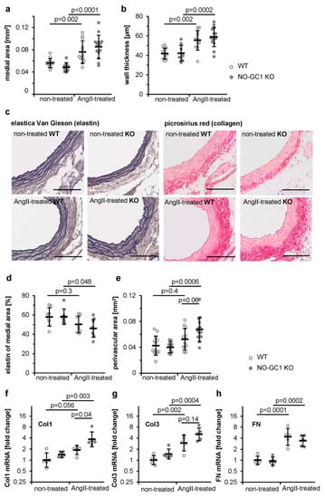 Vascular remodeling comprises changes of vessel geometry and extracellular matrix composition. Therefore, we analyzed aortic cross sections of WT and NO-GC1 KO mice with or without AngII-treatment. Aortic medial areas measured as a parameter for vascular remodeling of WT and NO-GC-1 KO mice were indistinguishable under non-treated conditions (Figure 1a); AngII treatment increased the medial areas comparably in both genotypes in WT and NO-GC1 KO, respectively. Likewise, the approximate 30% increase of the aortic wall thickness induced by AngII was similar in both mice strains (Figure 1b).