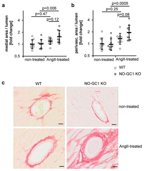 Next, we studied cardiac vessels by picrosirius red staining of heart sections and quantified vascular medial areas and perivascular fibrosis. In non-treated mice, the media to lumen ratios were indistinguishable (Figure 2a). In the NO-GC1 KOs only, AngII increased the media (by 52%, 10–109%). The perivascular area of cardiac vessels did not differ between WT and NO-GC1 KOs under non-treated conditions (Figure 2b). Analogous to the medial areas, AngII increased the perivascular collagen content in NO-GC1 KOs by 99% (31–203%) but not in WT (−11–101%, Figure 1c). The enhanced AngII-induced perivascular collagen deposition in the NO-GC1 KOs is in accordance with the augmented perivascular collagen deposition in the aortae.
