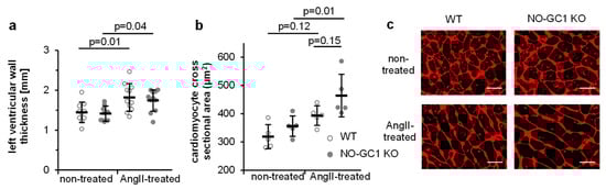 AngII induced increase of left ventricular wall thickness and cardiomyocyte cross sectional area. (a) Left ventricular wall thickness was measured in hearts of non-treated and AngII-treated WT and NO-GC1 KO mice. Individual values (per animal) are shown together with means ± SD. (b) Cardiomyocyte cross sectional areas of WGA-stained heart slices (c) were quantified. Individual values (per animal) are shown together with means ± SD. (c) Shown are representative WGA-stained heart sections. Scale bar, 20 µm.