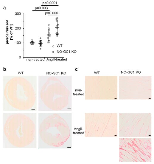 To determine cardiac interstitial fibrosis, we quantified (Figure 4a) picrosirius red-stained areas of cardiac sections (Figure 4b,c). While under non-treated conditions stained areas did not differ between WT and NO-GC1 KOs hearts (see Figure 4a), interstitial fibrosis induced by AngII increased by 109% (69–150%) in NO-GC1 KO compared to 54% (16–93%) in WT. Thus, interstitial fibrosis is enhanced by 32% in NO-GC1 deficient mice (7–56%). The blinded investigator did not quantify intensely stained areas found in the NO-GC1 heart sections after AngII treatment (see Figure 4b,c). These results underline the strong impact of cGMP on cardiac collagen synthesis and fibrosis.