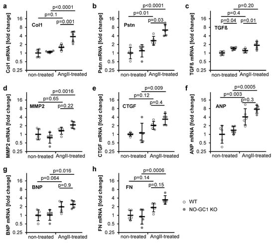 To confirm the findings, the expression of proteins implicated in cardiac fibrosis was measured by quantitative real-time PCR. ANP mRNA levels were similarly increased by the AngII treatment in WT and NO-GC1 KO mice (Figure 5f). Only the NO-GC1 KOs displayed AngII-induced increases of the fibrotic markers MMP2, CTGF, BNP, and FN (Figure 5d,e,g,h). Moreover, AngII increased Col1 mRNA only in the NO-GC1 KO (250%, 104–480%) leading to 138% (41–303%) higher Col1 levels in the NO-GC1 KO compared to WT (Figure 5a). Similarly, the AngII-induced cardiac periostin mRNA contents were 137% (6–430%) higher in NO-GC1 KOs than in WT (Figure 5b). Furthermore, the TGFβ mRNA content of NO-GC1 KOs was higher than in WT under non-treated (44%, 2–104%) and AngII-treated conditions (53%, 8–117%, Figure 5c). These findings corroborate the histological data obtained in cardiac slices and are in accordance with an inhibitory effect of NO-induced cGMP on collagen production and cardiac fibrosis.