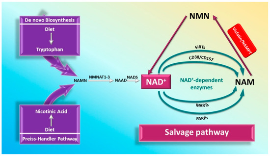 Cellular and metabolic processes require continuous activity of NAD-consuming enzymes. This prompts eukaryotic cells to resynthesize NAD from nictotinamide (NAM) using a salvage pathway. It should be noted that dietary intake of tryptophan or low amounts of niacin (less than 20 mg) is sufficient to fulfill the baseline needs for proper NAD biosynthesis [28]. The NAMPT-dependent salvage pathway remains a predominant pathway for NAD+ synthesis in mammals [31]. Notably, there is increasing evidence that increasing rates of NAD+ biosynthesis might have diverse protective roles against aging and stress [32,33], implicating a potential role of visfatin in regulating these processes.