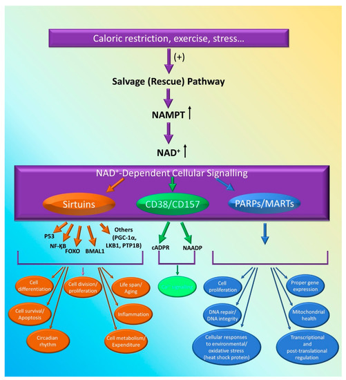 The salvage (rescue) pathway remains a predominant pathway to meet NAD+ cellular requirements. Several NAD+ dependent cellular signaling pathways exist and involve sirtuins, CD38/CD157, and PARPs/MARTs. They are essential for various cellular biological functions such as cellular division, proliferation, inflammation, maintaining genome integrity, DNA and protein synthesis, cellular anti-oxidative power, cellular metabolism, energy expenditure, mitochondrial health, and aging. FOXO: fork-head box class O; BMAL1: brain and muscle aryl hydrocarbon receptor nuclear translocator-like.
