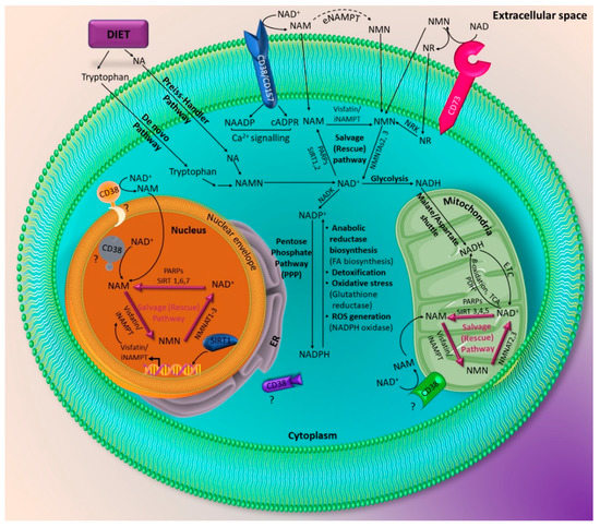 Various physiological roles of intracellular visfatin (iNAMPT). iNAMPT can be located in the cytoplasm, nucleus, and mitochondria. iNAMPT triggers its effects by regulating the levels of the core molecule NAD+. NAD+ levels are maintained through the de novo, Preiss–Handler, and salvage pathways. NAD+ is heavily converted to NAM by several cellular NAD+ dependent enzymes which include SIRT 1, 2 in the cytoplasm, SIRT 1, 6, 7 in the nucleus, and SIRT 3, 4, 5, in the mitochondria and PARPs. NAM will be converted to NMN via iNAMPT which is the rate limiting step in the salvage pathway. NAD+ can be regenerated from NMN via nicotinamide mononucleotide adenylyltransferases (NMNATs). The ectoenzyme CD38 converts NAD+ to NAM to produce NAADP and cADPR involved in intracellular Ca2+ signaling. CD38 can be also present on inner/outer mitochondrial membrane or inner/outer nuclear envelope. NAD+ can be metabolized extracellularly to NMN via the ectoenzyme CD73. NAD+ is a core molecule that plays a role in basic cellular metabolism. NAD+ is a key substrate for glycolysis, the tricarboxylic acid cycle (TCA), pyruvate dehydrogenase (PDH), beta-oxidation yielding NADH. The reduced form NADH can be regenerated via electron transport chain (ETC). NAD+ exist also in a phosphorylated form NADP+. The reduced form NADPH determines the anti-oxidative power of the cell. It is involved in anabolic biosynthesis (fatty acid (FA) biosynthesis), detoxification, cellular responses during oxidative stress via glutathione reductase, and protection against reactive oxygen species (ROS) via NADPH oxidase. NR: nicotinamide riboside.