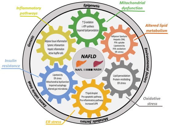 Factors contributing to development of NASH or progression of NAFL to NASH. NAFLD develops due to excess calorie intake, which leads to adipose tissue hypertrophy. Adipose tissue confronted with nutrient overload will increase lipolysis and change secretion of adipokines. This altered systemic situation of nutrients, lipids and adipokines, ultimately resulting in NAFLD, is modulated by genetic, epigenetic, environmental and metabolic factors (outer ring). Various molecular and cellular mechanisms (cogs) interact in development of NAFLD and NASH. Abbrevations: ATP: adenosine triphosphate; β-oxidation: beta oxidation of lipid components within mitochondria; DNL: de novo lipogenesis; ER stress: endoplasmatic reticulum stress; FFA: free fatty acids; UPR: unfolded protein response.