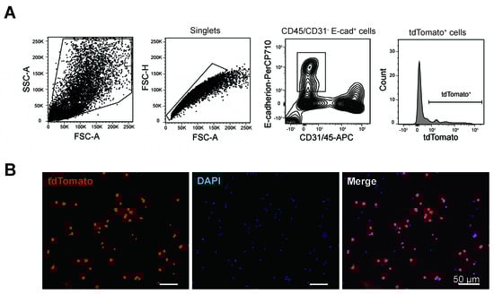 After pre-incubation with Ultra-LEAF purified anti-mouse CD16/32 Ab (Biolegend, San Diego, CA, USA) for 5 min on ice to block of Fc receptors, cells were incubated with primary Abs on ice for 45 min as follows: CD31-biotin (1:50, clone: 390, eBioscience, San Diego, CA, USA), CD45-biotin (1:100, clone: 30-F11, eBioscience) and CD324 (E-Cadherin )-PerCP-eFluor 710 (1:20, Thermo Fisher Scientific). After washing 3 times, cells were incubated with Streptavidin Allophycocyanin (1:200, APC, BD Biosciences, San Jose, CA, USA) secondary Ab for 30 min on ice. After washing 3 times, APC-negative, PerCP-eFluor 710-positive, and tdTomato-positive cells were sorted with a FACSAria cell sorter (BD Biosciences) in preparation for scRNA-seq. Cell viability following FACS was measured using trypan blue vital dye staining, and >95% of cells were confirmed to be viable. To confirm tdTomato expression in sorted cells, 1 × 105 sorted cells were fixed with 4% paraformaldehyde (PFA), and cytospins were prepared by applying cells to EZ Single Cytofunnels (Thermo Fisher Scientific). Cytospins were counterstained with 4’,6-diamidino-2-phenylindole (DAPI, Vector Laboratories, Burlingame, CA, USA), and tdTomato expression was confirmed using a Nikon Eclipse 80i microscope (Nikon Instruments, Inc., Melville, NY, USA).