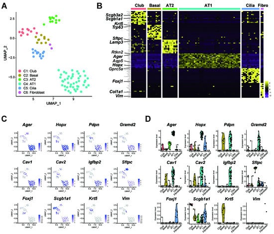 Clustering of 92 tdTomato-positive cells in ACID;R26tdTomato mice. (A) Unsupervised UMAP divided 92 cells into 6 clusters (C1–C6). Expression level (C and D) represents absolute read count. (B) Heatmap with 10–15 markers representative of each cell type. Yellow and purple colors indicate high and low expression, respectively. (C) UMAP plots with known cell type-specific marker genes. AT1 cells (Ager, Hopx, Pdpn, Igfbp2, Cav1, Cav2 and Gramd2), AT2 cells (Sftpc), club cells (Scgb1a1), basal cells (Krt5), ciliated cells (Foxj1) and fibroblasts (Vim). Blue and grey indicate high and low expression, respectively. (D) Violin plot with the same marker genes as in C.