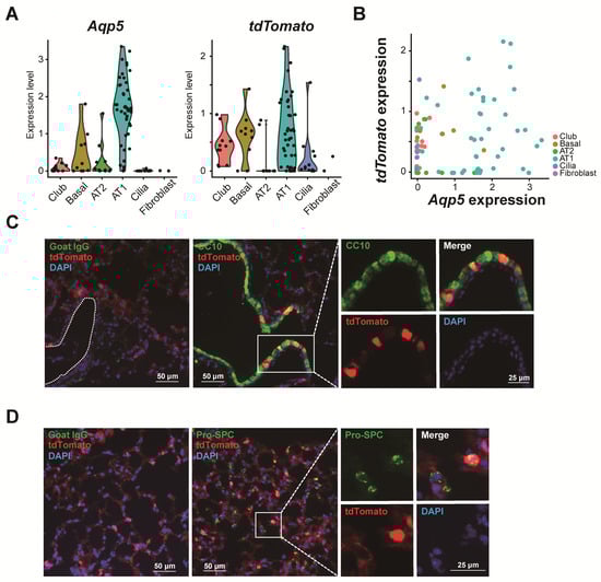 TdTomato expression in ACID;R26tdTomato mouse lung. (A) Violin plot for Aqp5 (left) and tdTomato (right). (B) Scatter plot between Aqp5 and tdTomato expression. (C) Immunofluorescence staining shows CC10 (green) and tdTomato (red) expression in ACID;R26tdTomato mouse lung. Goat IgG (left panel) was used as negative control. White dotted line indicates outline of airway. (D) Immunofluorescence staining shows pro-SP-C (green) and tdTomato (red) expression in ACID;R26tdTomato mouse lung. Goat IgG (left panel) was used as negative control.