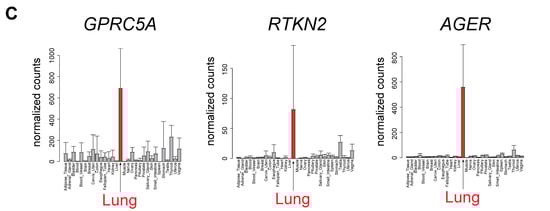 For mouse and rat, lungs were cleared of blood by perfusing in PBS, fixed in 4% PFA, incubated in sucrose solution, filled with Optimal Cutting Temperature Compound (OCT; VWR, Radnor, PA, USA))/50% PBS and frozen in OCT. Paraffin-embedded samples were prepared from human lungs that were deemed not suitable for transplantation. Lung cryosections (5 μm) were prepared as described [40]. Following antigen retrieval in Antigen Unmasking Solution at low pH (Vector Laboratories), slides of lung sections were incubated for 30 min in 0.2% Triton-X in PBS to permeabilize cells. After incubation in CAS block (Invitrogen/Zymed, San Diego, CA, USA), slides were incubated with primary Abs overnight at 4 °C. Goat anti-pro-SPC (sc-7706; Santa Cruz Biotechnology, Inc., Santa Cruz, CA, USA), mouse anti-ABCA3 (17-H5-24; Seven Hills, Cincinnati, OH, USA), mouse anti-HOPX (sc-398703; Santa Cruz), goat anti-AQP5 (sc-9890; Santa Cruz), goat anti-CC10 (sc-9772; Santa Cruz) or rabbit anti-GPRC5A (abx005719; Abbexa, Cambridge, UK) were used as primary Abs. Slides were then incubated with biotinylated anti-goat (Millipore, Temecula, CA, USA), biotinylated anti-rabbit (Millipore) or Alexa Fluor 594 anti-mouse (Thermo Fisher Scientific) secondary Abs, followed by streptavidin-FITC (Vector). Normal goat IgG (Vector), normal rabbit IgG (Vector) or normal mouse IgG (Vector) were used as negative controls. Finally, slides were mounted with Vectashield mounting medium including DAPI (Vector). Confocal images were captured using a Leica SP8 confocal system (Leica Microsystems), and negative controls were used to set the laser intensity (Supplemental Figures S7 and S8 and Figures 3C,D, 5A, 6A, and 7). Cytospins of crude cells harvested from digestion of mouse lungs were prepared as described for sorted cells above. For immunostaining, cytospins were post-fixed in 4% PFA, and antigen retrieval and staining were performed as described above for frozen lung sections. The percentage of cells that were double positive for tdTomato and pro-SPC or CC10 in immunofluorescence staining of lung sections was calculated by manually counting 10 random fields, and the percentage of cells that expressed tdTomato in immunofluorescence staining of cytospins was calculated by manually counting 5 random fields. Microscopic evaluation was independently validated by two blinded operators.