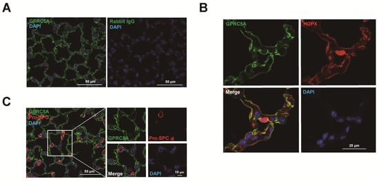 GPRC5A expression in mouse distal lung. (A) Representative single staining for GPRC5A (green) in mouse distal lung. Blue = DAPI. Rabbit IgG (right panel) was used as negative control. (B) Representative double staining for GPRC5A (green) and HOPX (red) in mouse distal lung. Blue = 4′,6-diamidino-2-phenylindole (DAPI). Negative controls are shown in Supplemental Figure S7A. (C) Representative double staining for GPRC5A (green) and pro-SPC (red) in mouse distal lung. Blue = DAPI. Negative controls are shown in Supplemental Figure S7B.