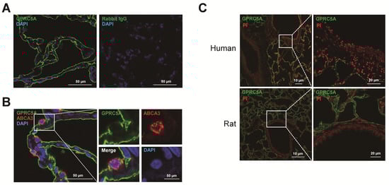 GPRC5A expression in human and rat lung. (A) Representative single staining for GPRC5A (green) in human distal lung. Blue = DAPI. Rabbit IgG (right panel) is the negative control. (B) Representative double staining for GPRC5A (green) and ABCA3 (red) in human distal lung. Blue = DAPI. Negative controls are showed in Supplemental Figure S7C. (C) Representative single staining for GPRC5A (green) in human (upper panel) and rat (lower panel) airway. White box indicates airway. Red = propidium iodide (PI).
