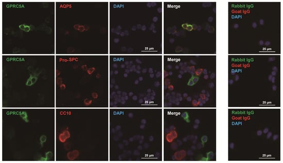 Co-staining of GPRC5A with AQP5, pro-SPC and CC10 in crude cytospin preparations from mouse lung. Representative double staining for GPRC5A (green) and AQP5 (upper panel, red), pro-SPC (middle panel, red) or CC10 (lower panel, red) in cytospins of crude preparations from digested mouse lung tissue. Blue = DAPI. Rabbit and goat IgG were negative controls.