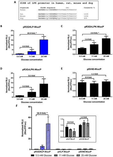 Effects of conserved glucose responsive elements in liver pyruvate kinase (LPK) promoter, glucose responsive elements (R3G) in converting constitutive human liver-specific promoter to glucose responsive human liver-specific promoter. (A) Sequence alignment of glucose responsive element (GlRE) sequences from LPK promoters between human, rat, mouse and dog. The conserved regions consist of carbohydrate response element (ChoRE) sequence and DR1 site. (B) Glucose responsive gene expression by R3GHLP glucose responsive human liver-specific promoter. (C) R3GhLPK and (D) R3GrLPK with human and rat LPK minimal promoters, respectively, were used as positive controls. (E) SV40 promoter was used as negative control. (F) Comparison of glucose responsiveness and gene expression level of R3GHLP glucose responsive human liver-specific promoter versus HLP constitutive human liver-specific promoter. Freshly isolated primary rat hepatocytes (rHeps) culture were co-transfected with experimental plasmid expressing PEST-destabilized nanoLuc luciferase (NlucP) reporter plasmid and pSV40-Luc2 expressing firefly luciferase (Fluc) constitutively expressed control reporter plasmid. For each sample, NlucP activity was normalized to Fluc activity from pSV40-Luc2 regulated by SV40 constitutive promoter. Glucose were added to a final concentration of 5.5 mM, 11 mM, or 25 mM. Data were presented as mean ± standard error of mean (s.e.m.) n = 3. Statistical significances were determined by Student’s unpaired t-test where * indicates p < 0.05 and considered statistically significant.