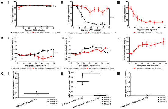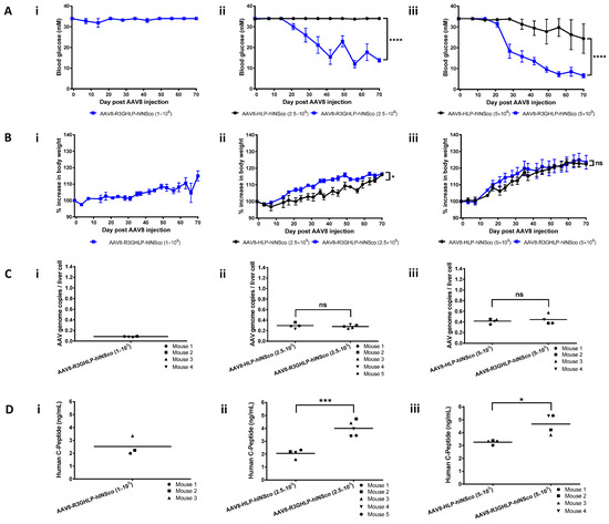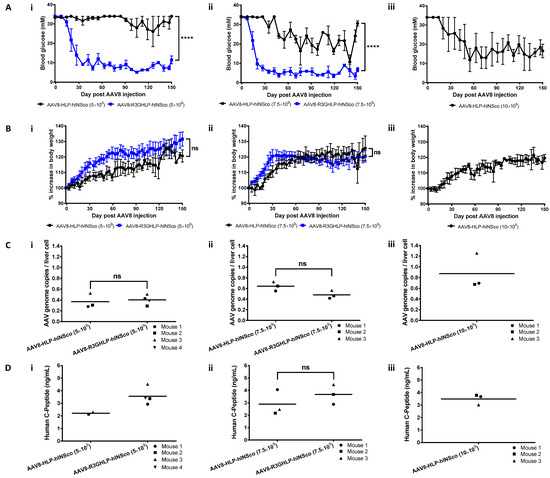 In a subsequent experiment we repeated the effective dose of 5 × 109 vg/mouse (Figure 3Ai,Bi), with additional groups of higher doses at 7.5 × 109 (Figure 3Aii,Bii) and 10 × 109 (Figure 3Aiii,Biii) vg/mouse to determine the maximum insulin vector dose that the mice can tolerate.