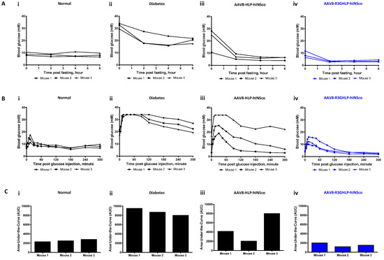 Effect of fasting (Figure 4A) and intraperitoneal glucose tolerance test (IPGTT; Figure 4B) were studied on normal (Figure 4Ai,Bi) and diabetic (Figure 4Aii,Bii) mice to serve as controls for comparison with diabetic mice injected with AAV8-HLP-hINSco (7.5 × 109 vg/mouse; Figure 4Aiii,Biii) and AAV8-R3GHLP-hINSco (5 × 109 vg/mouse; Figure 4Aiv,Biv).