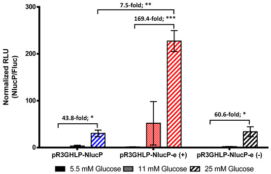 To date, several groups have generated glucose responsive promoters with the incorporation of GlREs. When compared between the fold increases of gene expression in vitro between cells exposed to <5.5 mM versus >20 mM glucose, the extent of the glucose responsiveness varied across different promoters. For instance, glucose responsiveness was in the range of 2 to 3-fold increase when GlRE was coupled with LPK [29,31], IGFBP1 [28,32], or G6Pase [30] promoters. The best reported glucose responsiveness was observed with albumin promoter with 8 to 9-fold increase of gene expression level [19,27]. In this study, when tested in rHeps, glucose responsiveness between 5.5 mM versus 25 mM glucose of R3GHLP promoter were in range of 20.9 to 58.9-fold when using the NlucP as reporter gene (Figure 1B,F and Figure 5) compared to R3GhLPK 2.6-fold (Figure 1C) and R3GrLPK 8.5-fold (Figure 1D). We chose to test the glucose responsive promoter in rHeps to better represent the normal hepatocytes. The difference in glucose responsiveness fold was probably due to batch to batch variation of the isolated primary cells rHeps used.