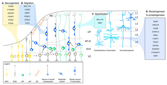 Schematic representation of ASD risk genes involved in corticogenesis reviewed here. Migrating neurons and laminar specific neurons are indicated in different blue tones. NPC, neural progenitor cells; RGC, radial glial cells; bIP, basal intermediate progenitors; aIP, apical intermediate progenitors; CR, Cajal-Retzius cells; MZ, marginal zone; CP, cortical plate; SP-IZ, subplate-intermediate zone; SVZ, subventricular zone; VZ, ventricular zone; L1-6, layers 1-6. Interneurons, cortical afferents, and gliogenesis are not shown for simplicity.