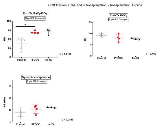 - Control: Lungs were retrieved and stored for 24 h at 4 °C. EVLP was performed without PFCOC. The left lung was transplanted after 6 h of EVLP. Observation of the transplanted lung was 4 h (n = 5).