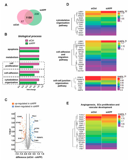 3.2. Proteomic Analysis Confirms the Cytoskeleton Organization Defect and Reveals Alteration of Vascular Specific Pathways in APP-Silenced Cells