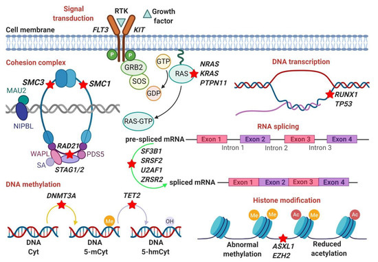 The cohesion complex is known to align and stabilize replicated chromosomes prior to cell division. Nonsense and frameshift mutations occur in four core subunits of the cohesin complex (SMC3, SMC1A, RAD21, STAG2), which serve as transcriptional coactivators. They are often heterozygous and result in haploinsufficiency or dominant-negative effects. As a whole, the mutational frequency is about 12–20% in AML and MDS with a particular prevalence in high-risk MDS and secondary AML. STAG2 is the most mutated core subunits in AML [89]. Studies have demonstrated that STAG2 mutations are very early events occurring in naïve stem cells and affecting dominant clones [108]. Figure 1 illustrates the main altered genetic pathways in MDS as discussed in this section.