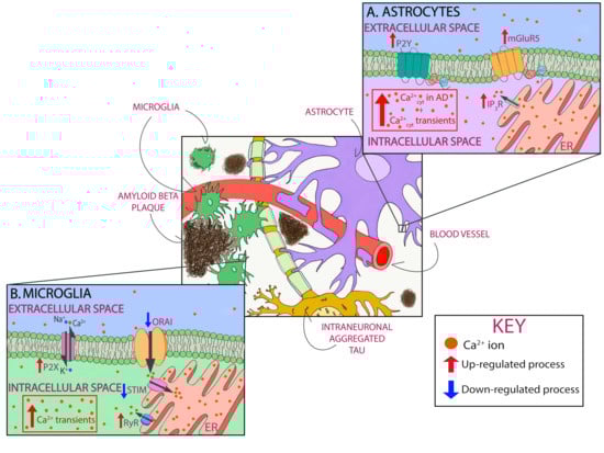 Astrocytic and microglial Ca2+ as a therapeutic target in AD. Schematic of glial Ca2+ cells dysregulation in the presence of AD pathology. In astrocytes, P2Y purinoceptors and glutamate metabotropic receptors mGluR5, when activated, cause Ca2+ increase by releasing Ca2+ from intracellular stores. As shown in red, all three receptors are upregulated in AD. In addition, cytosolic Ca2+ levels are increased in astrocytes, and they exhibit Ca2+ transients (A). In microglia, P2X receptors are upregulated in AD, thus leading to Ca2+ dysregulation. SOCE, with involves STIM and Orai, is also responsible for Ca2+ influx, specifically into the lumen of the endoplasmic reticulum (ER). This pathway is downregulated in AD (shown in blue). RyRs mediate Ca2+ efflux from the ER, a process that is upregulated in AD. Microglia also show Ca2+ dysregulation by showing cytosolic Ca2+ transients (B).