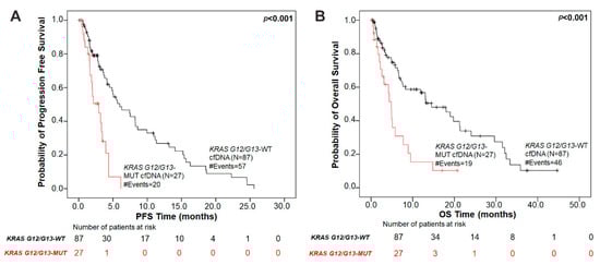 Next, we performed Kaplan–Meier survival analysis to investigate whether KRAS G12/G13 mutation status in cfDNA provides meaningful prognostic information in patients with NSCLC. Firstly, KRAS G12/G13 mutational load in plasma was used as a categorical variable (presence versus absence of KRAS G12/G13 mutations in cfDNA) to dichotomize our patient cohort into two groups. NSCLC patients in the KRAS G12/G13-mutant cfDNA group had significantly (p < 0.001) shorter PFS intervals compared to patients in the KRAS G12/G13-wild type cfDNA group (Figure 1). The median PFS of patients with KRAS G12/G13-mutant cfDNA was 2.93 months (95% CI = 1.61–6.15 months) as compared to 5.98 months (95% CI = 4.14–25.58 months) for patients in the KRAS G12/G13-wild type cfDNA group.