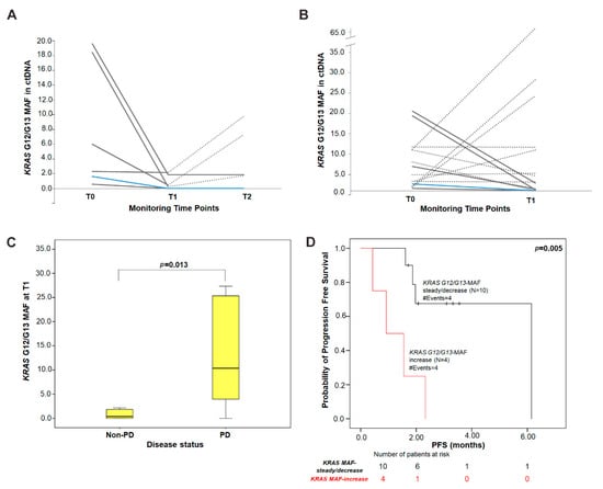 Serial monitoring of KRAS G12/G13 MAF in plasma cfDNA during treatment. Changes in KRAS G12/G13 MAF in (A) a subset of patients (N = 6) with available three time-points during treatment and (B) in all patients (N = 14) from baseline to T1. Each line represents one patient; dashed lines depict progressive disease (PD); solid grey lines indicate stable disease (SD) and the blue line indicates a patient with partial response (PR); (C) distribution of the absolute levels of KRAS G12/G13 MAF at T1 in patients experiencing PD (median = 10.38% MAF) compared to patients with non-PD (PR/SD; median = 0.35% MAF). p-value was calculated by the Mann–Whitney U-test; (D) Kaplan–Meier PFS survival curve according to KRAS G12/G13 MAF variation from baseline to T1 (p = 0.005). Patients were categorized into KRAS G12/G13 MAF-increase group and KRAS G12/G13 MAF-steady/decrease group according to the cut-off of ≥1.5-fold change in MAF from baseline. p values were calculated via the log-rank algorithm. T0: baseline; T1: time of first response evaluation; T2: disease progression or end of first-line treatment; PD: progressive disease; PR: partial response; SD: stable disease.