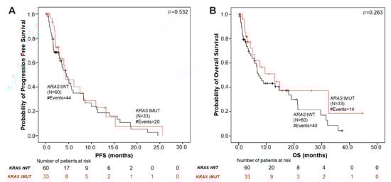 Using Kaplan–Meier survival analyses, no significant association was found between the presence of KRAS mutations in tumor tissue and patient’s prognosis in terms of both PFS (p = 0.532) and OS (p = 0.263) (Figure 3).