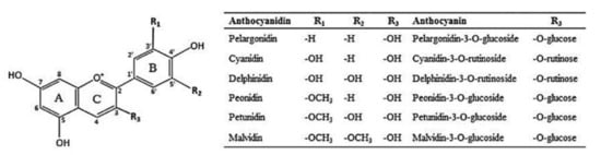 Figure 1. Structure of anthocyanidins commonly found in berry fruits and examples of corresponding anthocyanins with R3 glycosides. Reproduced with permission from [7].