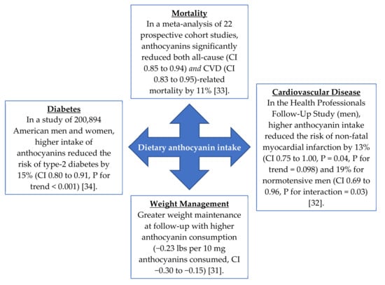 The bioactivity of berry anthocyanins has been described in rodent models of diet-induced and genetic forms of obesity and diabetes [10,11,12,13,14,15,16,17,18,19,20]. Further, positive health effects are also being reported in controlled clinical trials with berry interventions [21,22,23,24,25,26,27,28,29]. Improved insulin sensitivity is observed in overweight or obese subjects consuming anthocyanin-rich treatments [25,26,29]. One meta-analysis of five prospective cohort studies also supports the rodent and clinical evidence, where each 7.5 mg increment in daily anthocyanin consumption corresponded to an added 5% reduction in the risk of developing type-2 diabetes [30]. Pertinent epidemiological discoveries of anthocyanin consumption in human health are summarized in Figure 2 [31,32,33,34].