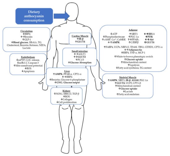 66. Nizamutdinova, I.T.; Jin, Y.C.; Chung, J.I.; Shin, S.C.; Lee, S.J.; Seo, H.G.; Lee, J.H.; Chang, K.C.; Kim, H.J. The anti-diabetic effect of anthocyanins in streptozotocin-induced diabetic rats through glucose transporter 4 regulation and prevention of insulin resistance and pancreatic apoptosis. Mol. Nutr. Food Res. 2009, 53, 1419–1429. [Google Scholar] [CrossRef]