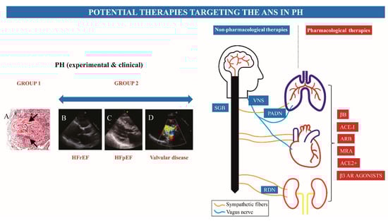 The autonomic nervous system (ANS) and renin-angiotensin-aldosterone system (RAAS) are central to the neurohormonal regulation of cardiovascular and pulmonary function and are closely involved in many cardiopulmonary disorders. In this review, we focus on the role of neurohormonal activation in PH and current evidence of potential therapies targeting the ANS/RAAS in this condition, particularly in Groups 1 and 2. PAH, although infrequent (prevalence of 16 cases/million []), is the hallmark of PH and the group in which the most important advances in the understanding and treatment of the disease have been achieved during the last decade. Still, current treatments for PAH remain limited to relaxing the pulmonary vasculature, aiming to reduce RV afterload, and secondarily improving RV function, but have limited direct effects on cardiac function or arterial remodeling. Although pulmonary vasodilator drugs (i.e., prostanoids, endothelin receptor antagonists, phosphodiesterase-5 inhibitors, and soluble guanylate cyclase stimulators) have demonstrated benefit in improving exercise capacity and slightly prolong survival of PAH patients, they do not provide a substantial increase in lifespan or quality of life. Group 2 PH is more prevalent than Group 1 with HF being the most common etiology of PH globally. It is estimated that approximately 50% of patients with chronic HF have secondary PH [], which results in more severe symptoms, worse exercise tolerance, and poorer prognosis [,]. Despite this burden of disease, unfortunately there are no specific pharmacological treatments available for patients with Group 2 PH []. Thus, further research on the mechanisms involved and novel therapeutic targets with robust prognostic impact are necessary for both PAH and PH secondary to HF, the latter even of greater importance since it could be applied to a large, rapidly increasing number of patients.