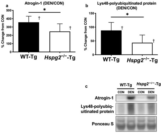 Changes in ubiquitin ligase and polyubiquitinated protein content 4 days after denervation surgery. Atrogin-1 and Lys48–polyubiquitin protein contents in the gastrocnemius muscle were measured 4 days after surgery by performing total protein extraction and Western blotting. Percent changes in atrogin-1 (a) and Lys48–polyubiquitin (b) protein contents were determined by comparing the DEN and CON muscles. In the WT-Tg and Hspg2−/−-Tg mice, atrogin-1 and Lys48–polyubiquitin protein expression in the DEN samples increased significantly compared to that in the CON samples. For atrogin-1 and Lys48–polyubiquitin protein content, the percent changes between the DEN and CON muscles were significantly different between the WT-Tg and Hspg2−/−-Tg mice. †, DEN was significantly different from CON within the same group (p < 0.05, n = 6). *, significantly different between the two groups (* p < 0.05, n = 6). Values are the mean ± SD. (c) Western blotting results represent the levels of atrogin-1, Lys48–polyubiquitin protein, and total protein by Ponceau S staining.