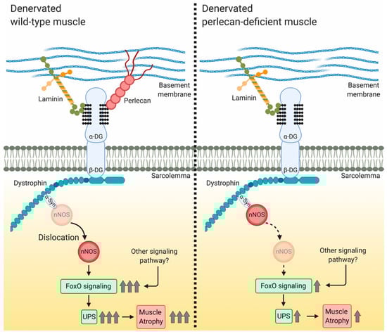 During skeletal muscle denervation, perlecan promotes nNOS delocalization from the membrane to the cytosol, where delocalized nNOS promotes protein degradation and muscle atrophy by activating FoxO signaling and the ubiquitin–proteasome system (Figure 5). Although this study was limited to muscle atrophy based on denervation, it is the first report to show that perlecan is related to nNOS delocalization and impacts skeletal muscle mechanotransduction. In contrast to other DGC-related molecules, such as sarcoglycans and biglycans [,,,,], perlecan deficiency suppresses the delocalization of nNOS, and therefore, it is considered a promoter of nNOS delocalization. Further studies, particularly structural biological analyses of the DGC nNOS-binding domain, will reveal the precise mechanism underlying the effect of perlecan on nNOS delocalization.
