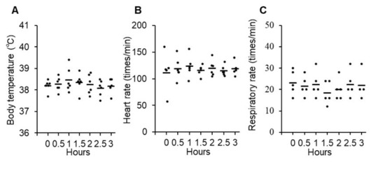 Evaluation of acute adverse effects of P38Bf administration in three dogs. Effects of P38Bf administration on body temperature (A), heart rate (B) and respiratory rate (C). Each dot represents an individual subject at one P38Bf administration and horizontal bars indicate the mean value for all patients at each time point. Significant changes in each parameter were not observed. One-way ANOVA test was performed and p values were 0.77, 0.98, and 0.85, respectively.