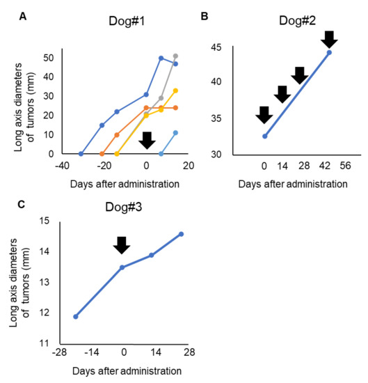 Evaluation of P38Bf efficiency in the clinical trial. Measurement and evaluation of the skin metastasis of Dog #1 (A), the oral primary tumor of Dog#2 (B), and the oral primary tumor of Dog#3 (C). The tumor burden of Dog#1, Dog#2, and Dog#3 was evaluated by measuring the diameter of the long axis. The day of first antibody administration is shown as Day 0, and black arrows indicate the timing of P38Bf administration.