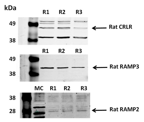 IM tissue lysates were also subject to Western analysis and probed with antibodies to CRLR, RAMP2 and RAMP3. Our results show that the 53-kDa band of CRLR protein, the 50-kDa band of RAMP3 protein, and the 20-kDa band of RAMP2 protein are detected in the IM. CRLR and RAMP3 are expressed at a significant protein level. However, RAMP2 was expressed at a very low level (Figure 1). The antibodies for CRLR, RAMP2, and RAMP3 were characterized in mice so mouse samples were used as positive controls (data not shown) to verify the Western blot results in rat tissues.