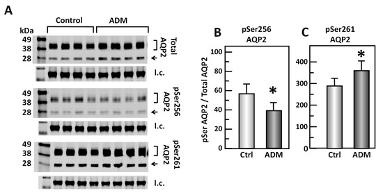 To test the role of ADM in the phosphorylation of AQP2, IM tissues were incubated in isotonic medium with ADM for 30 min. Tissue lysates were analyzed by Western blot, probing for total AQP2, pSer256 AQP2, and pSer261 AQP2 (Figure 3A). ADM significantly decreased the amount of AQP2 that was phosphorylated at serine 256 by 25% (control: 0.57 ± 0.10, ADM-treated: 0.43 ± 0.08, n = 16, p < 0.05; Figure 3B). ADM significantly increased the phosphorylation at serine 261 by 24% (control: 2.93 ± 0.35, ADM-treated: 3.62 ± 0.4, n = 16, p < 0.05; Figure 3C).