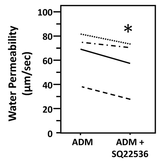 Inhibition of cAMP with SQ22536 further decreases ADM-reduced osmotic water permeability. Terminal IMCDs were perfused with 100 nM adrenomedullin (ADM) for 30 min then 300 µM SQ22536 was added and perfusion continued with ADM + SQ22536 for a further 20 min. Each line represents a separate IMCD from a different rat. * p < 0.05 ADM control vs. ADM + SQ22536, n = 4 rats/condition.