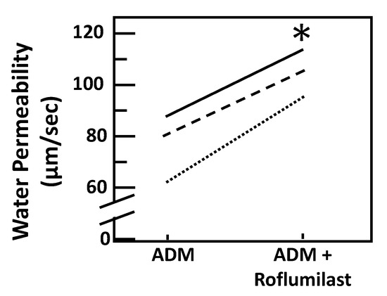 To test ADM-attenuated osmotic water permeability through a cAMP pathway, IMCDs were first perfused with ADM, then perfused with SQ22536, an adenylyl cyclase inhibitor, in the presence of ADM. SQ22536 further decreased the ADM-attenuated Pf from 66 ± 10 to 58 ± 11 µm/s (n = 4, p < 0.05; Figure 4). To further identify the role of cAMP in ADM-attenuated osmotic water permeability, IMCDs were perfused with ADM, then perfused with roflumilast, a phosphodiesterase inhibitor, in the presence of ADM. Roflumilast increased the ADM-attenuated Pf from 73.42 ± 10.68 to 103.83 ± 5.48 µm/s (n = 3, p < 0.05; Figure 5).
