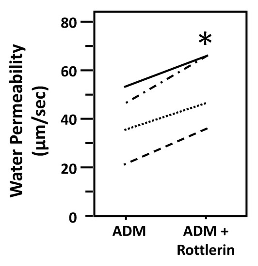 To test whether ADM-attenuated osmotic water permeability through a PKC pathway, IMCDs were first perfused with ADM, then perfused with rottlerin, a PKC inhibitor, in the presence of ADM. Rottlerin increased Pf from 38 ± 7 to 52 ± 6 µm/s (n = 4, p < 0.05; Figure 9).