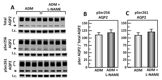 To test whether cGMP regulates the ADM-mediated phosphorylation of AQP2, IM tissues were incubated in isotonic medium with ADM for 30 min and then treated with L-NAME for 20 min. Tissue lysates were analyzed by western blot, probing for total AQP2, pSer256 AQP2, and pSer261 AQP2 (Figure 11A). Inhibition of cGMP by L-NAME did not change pSer256 AQP2 (ADM control: 1.11 ± 0.08, L-NAME-treated: 1.19 ± 0.09, n = 4; Figure 11B) and the pSer261 AQP2 (ADM control: 1.10 ± 0.08, L-NAME-treated: 1.21 ± 0.07, n = 4; Figure 11C).